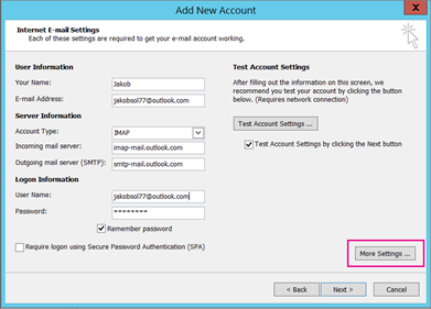 Choose Next to test your settings. Note: the most common reason for the connection not working is a typo in the email or password. Unfortunately Outlook doesn't tell you that's the problem but gives you an uncomprehensible error message. If the connection doesn't work, double-check everything for typos.