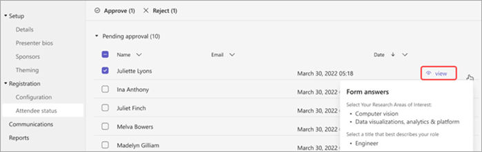 Select view in the attendee's row to see their answers to the registration form.