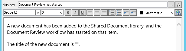 So far, the body text in the example email is static: Every time the workflow creates an instance of the email, the text will be exactly the same.