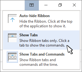 Show tabs only shows only the ribbon tabs, so you see more of your document, and you can still quickly switch among the tabs.