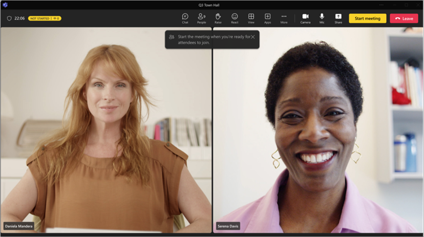 You'll automatically join the green room before starting the meeting for attendees. Bring presenters on screen, set up shared content, and more.