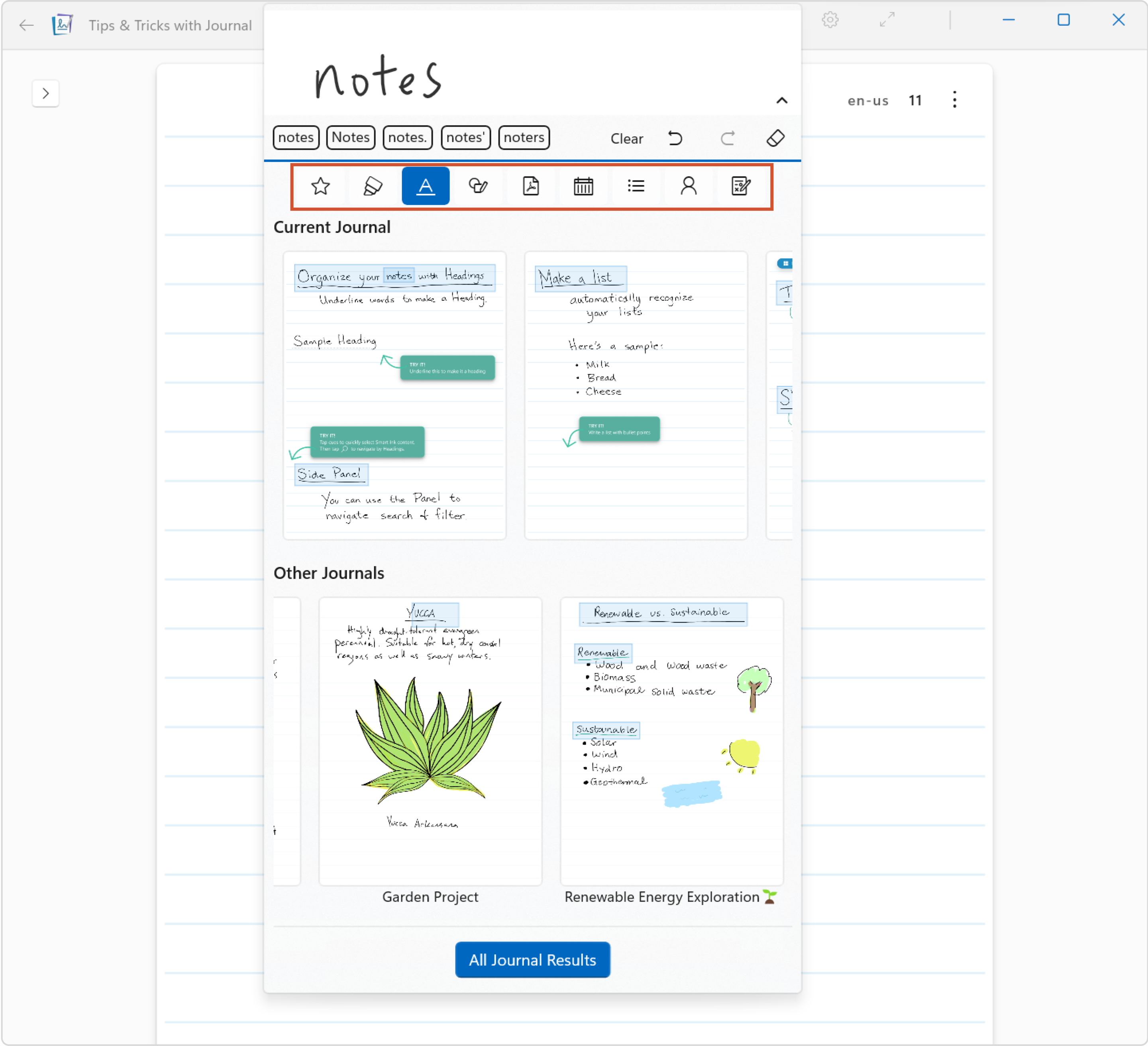 The Search Panel on the top of Microsoft Journal provides a powerful Search experience. You can add a filter to refine your content search, with or without a keyword.