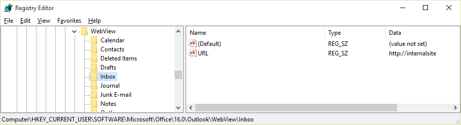 [HKEY_CURRENT_USER\Software\Microsoft\Office\16.0\Outlook\WebView\Inbox] "URL"="http://[place internal URL here]"