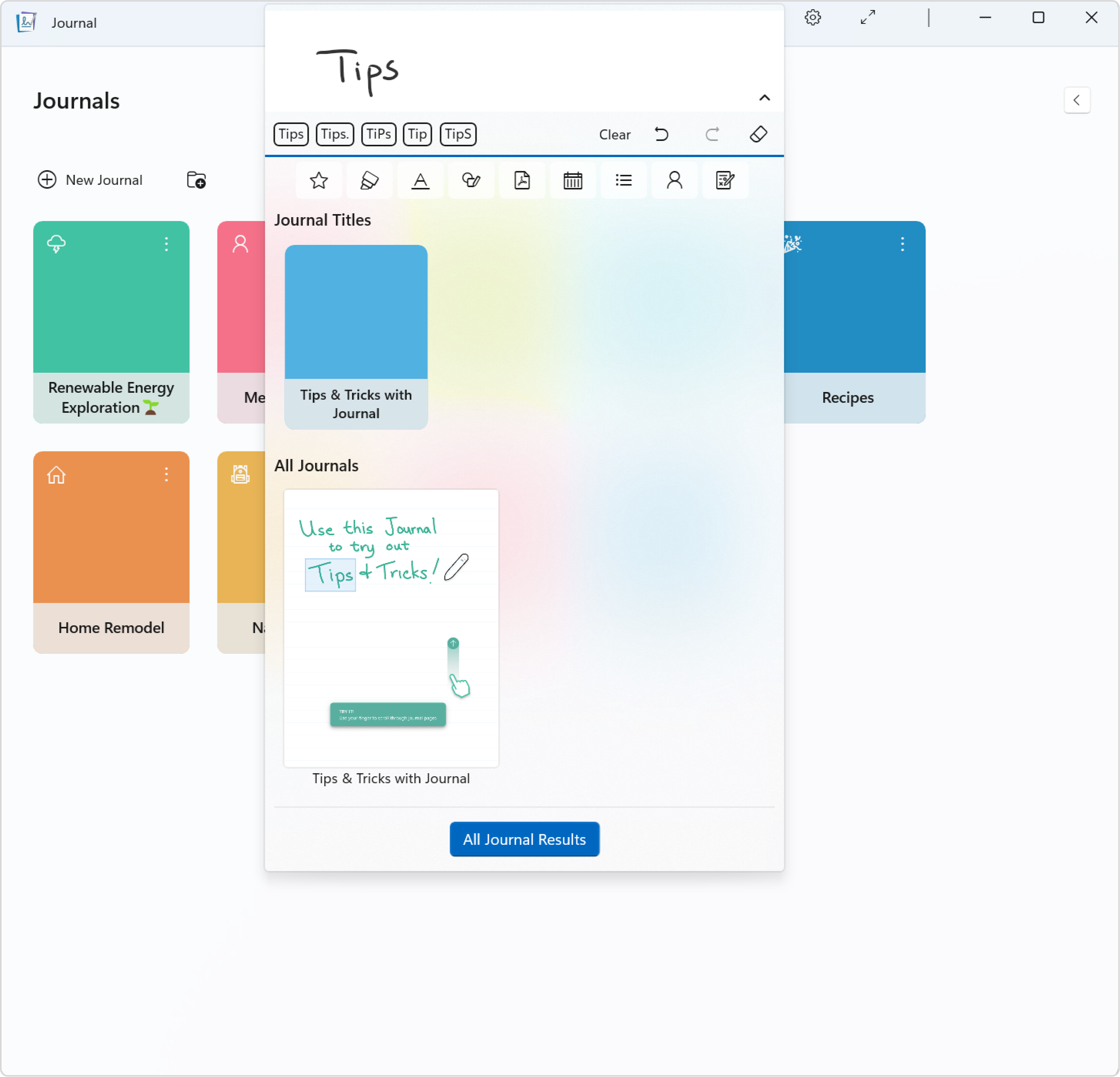 The Search Bar at the top of Microsoft Journal brings you a powerful search experience. Quickly start a keyword search from anywhere in the app and add filters to enhance your search.