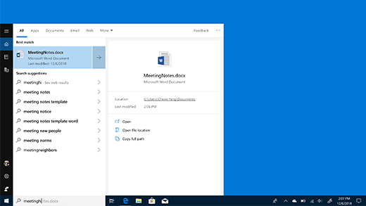 Search from the taskbar: Type the name of a document (or a keyword from it) into the search box on the taskbar. You'll see results for documents across your PC and OneDrive under Best match.